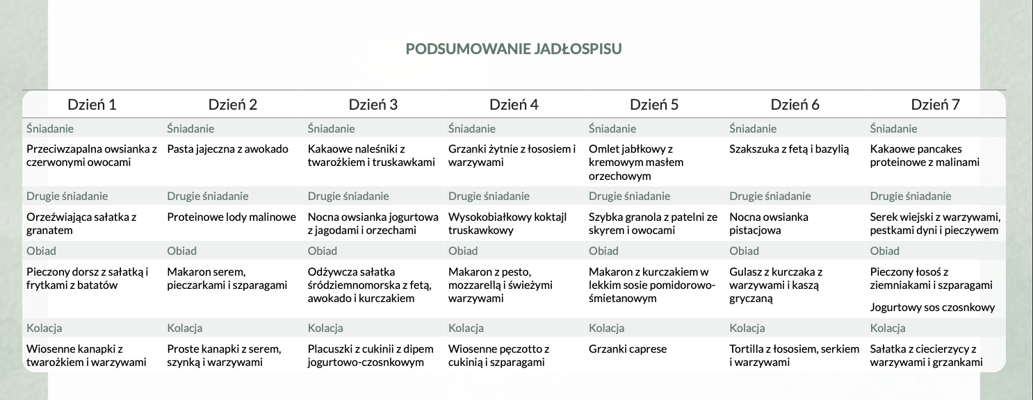 Jeśli masz więcej problemów zdrowotnych, choroby współistniejące, alergie pokarmowe lub specyficzne potrzeby żywieniowe, lepszym rozwiązaniem może być indywidualna współpraca dietetyczna lub konsultacja. Gotowy jadłospis ma charakter uniwersalny i nie zastępuje indywidualnie dopasowanej terapii żywieniowej.